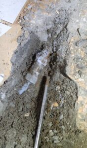 정확한 위치가 파악된 후, 미세한 균열이 있는 배관 부위를 중심으로 바닥을 부분 절개하여 노출시켰습니다. 해당 구간은 오래된 PB배관이었고, 표면에 녹과 백화 현상이 있었습니다.